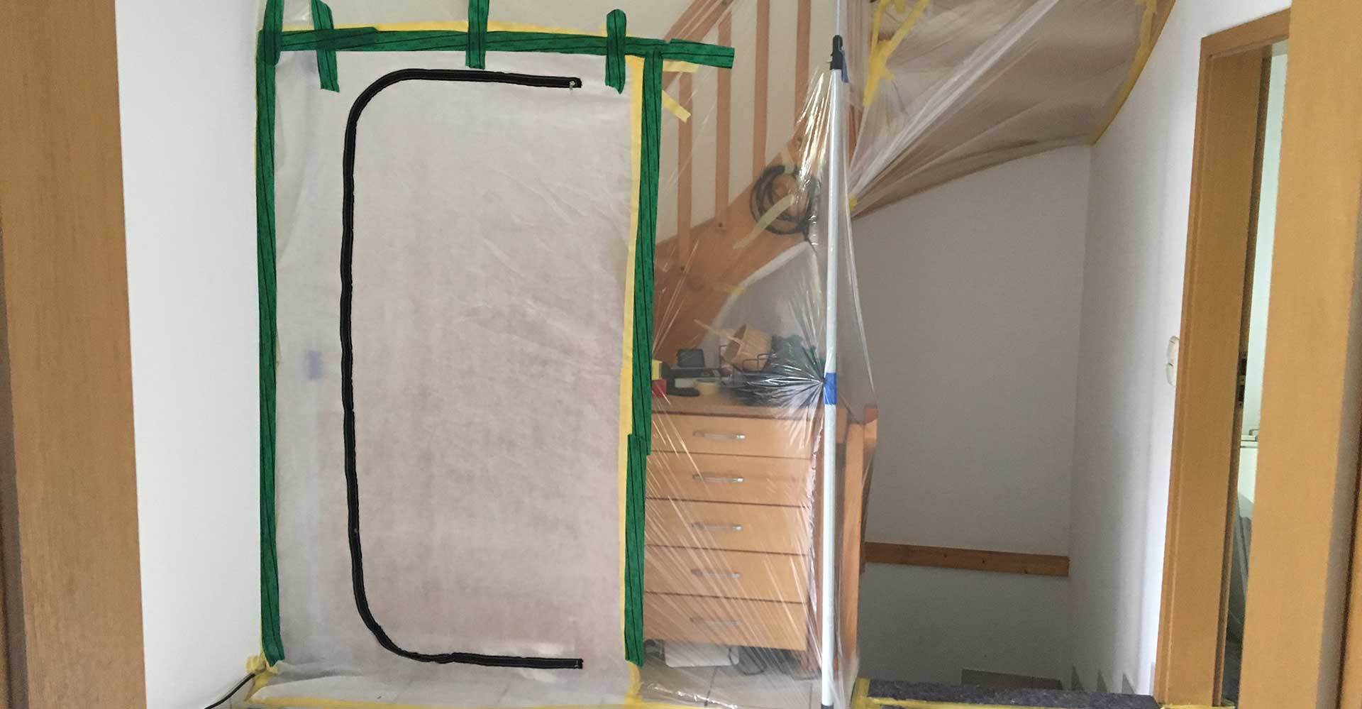 Den mit Schimmelpilz befallenen Bereich grenzen wir staubdicht und sicher mit Folienwänden ab. Ein Unterdruckgerät verhindert, dass sich die Sporen im Wohnbereich verbreiten können.